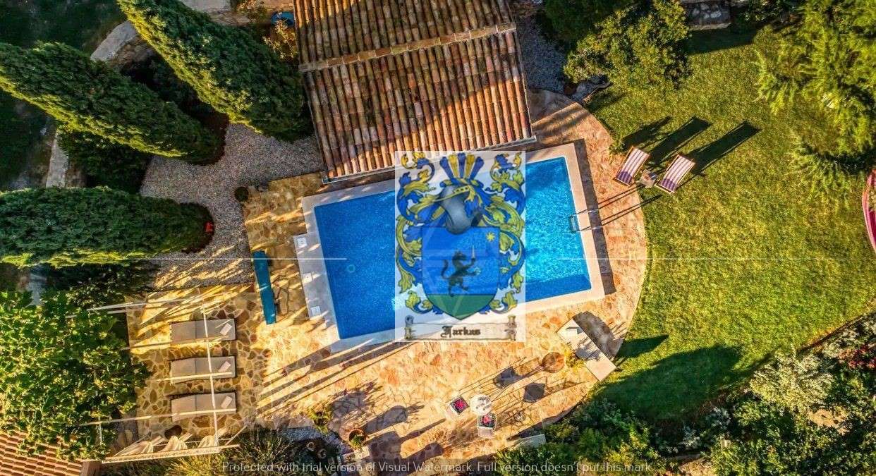 The house is fully air-conditioned, has a swimming pool with sun deck a garden covered terrace with fireplace, and has three parking spaces.