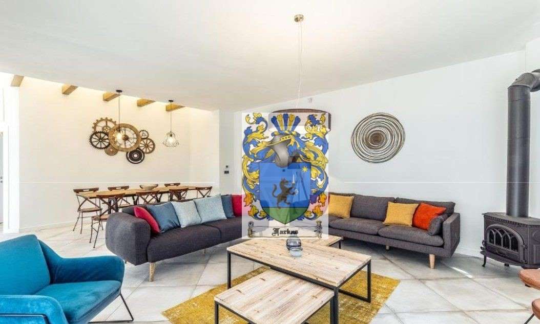 The house is fully air conditioned via a heat pump system for cooling and heating, has three parking spaces a landscaped garden with a large pool of 40 m2 and sun deck, and has a covered terrace with outdoor fireplace, alarm system and automatic irrigation system.
