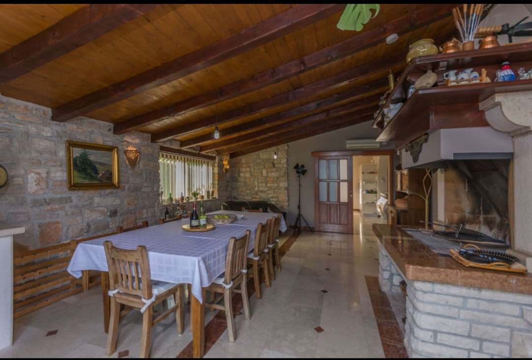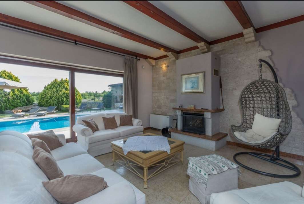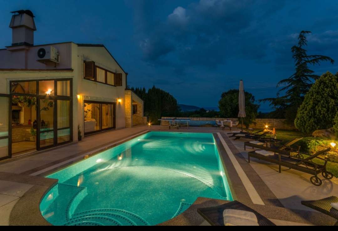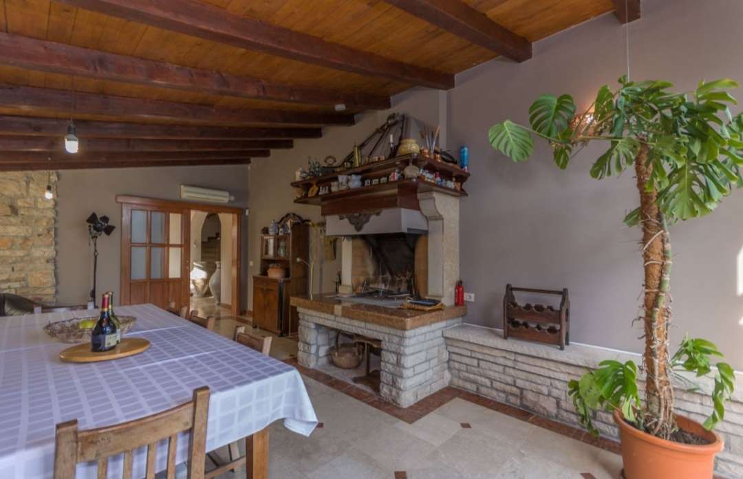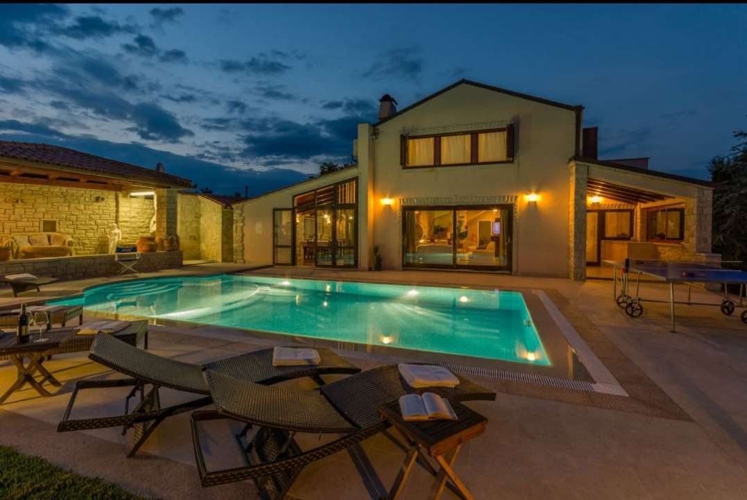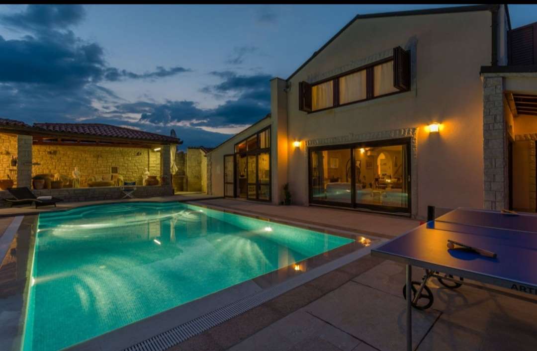 A villa with a Roman swimming pool, located in the small Istrian tourist town of Rakalj, 1.5 km from the sea and 25 km from the beautiful historic city of Pula. The villa is an exclusive example of a luxury villa. This superb villa exudes first-class elegance and a unique exterior and interior. The villa is in complete harmony and symphony with the environment and the natural beauty of this beautiful landscape. The villa is a reflection of an elegant combination of stone and wood, bold design and daring playful architecture. The villa is spread over a property of 1005 m², and the villa itself has an area of 350 m² and has two floors: ground floor and first floor. The property of the villa is accessed by stone stairs that lead to the spacious ground floor of the residence. In this part there is a living room equipped with comfortable seating, a beautiful fireplace and modern technology. The entire side of the living room is dotted with a glass wall that stretches across the surface of the entire wall and offers an incredible view of the "green wall", i.e. the beautiful landscape, the island of Cres, Lošinj and the entire Kvarner Bay. . On the ground floor there is also an open, fully equipped, modern kitchen, two dining rooms with matching furniture, another living room equipped with sofas, a guest toilet and a bedroom with a modern bathroom. In this part of the villa there is also an auxiliary room. A massive stone staircase connects the ground floor with the first floor. in which there are 2 bedrooms with double beds, two bathrooms and a terrace with a unique view of the entire garden and the rich contents of this elegant and graceful masterpiece. The exit from the ground floor of the residence leads to a beautiful courtyard, where there is an originally conceived and designed covered summer hacienda, lounge furniture and barbecue. This space is ideal for socializing and relaxing with good company and the top gastronomic offer, for which the Istrian region is widely known. The property also has a guest house of 50 m² with an open plan living room, kitchen, bedroom and bathroom. In the central part of the property there is a beautiful heated pool with counter-current swimming of 40 m². It is truly the crowning glory of this charming property. There is also an outdoor shower and toilet for guests. The villa is fully air-conditioned and has gas central heating. Main features of the property: Sea view Proximity to the sea Privacy and quiet location Indoor and outdoor floors - paved with stone - various solar panels Basement Roman pool with counter current swimming Timeless style.