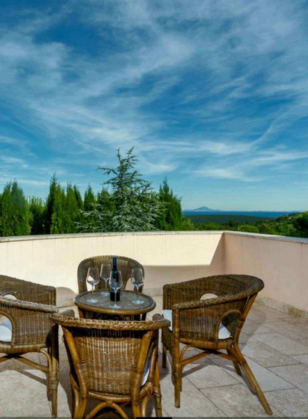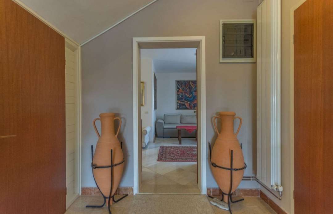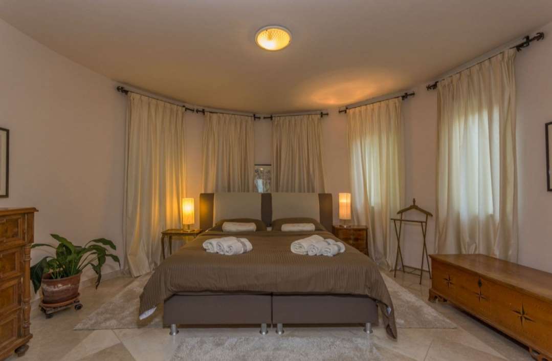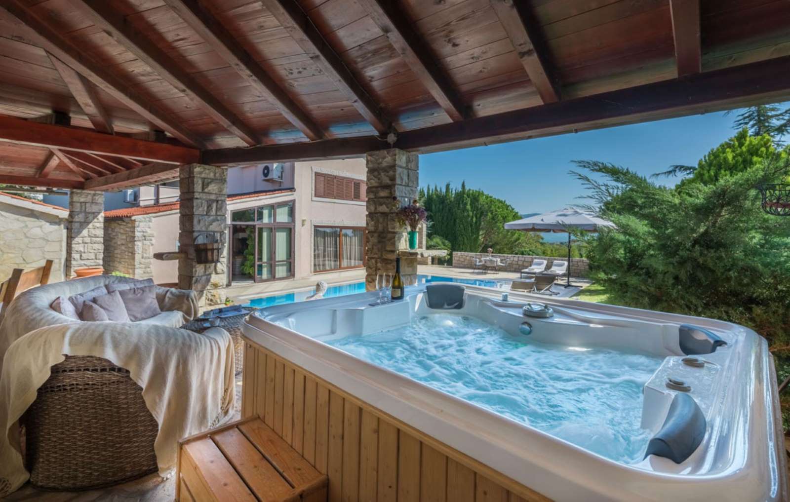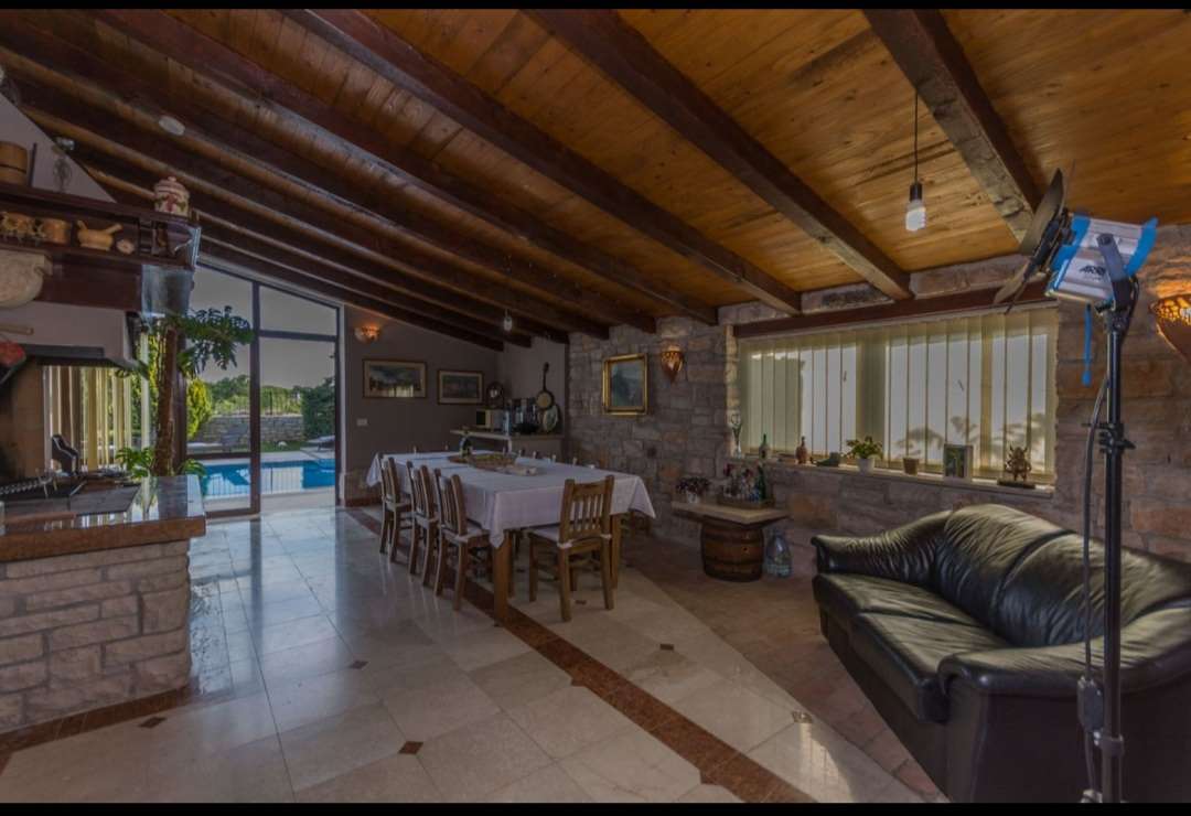 A villa with a Roman swimming pool, located in the small Istrian tourist town of Rakalj, 1.5 km from the sea and 25 km from the beautiful historic city of Pula. The villa is an exclusive example of a luxury villa. This superb villa exudes first-class elegance and a unique exterior and interior. The villa is in complete harmony and symphony with the environment and the natural beauty of this beautiful landscape. The villa is a reflection of an elegant combination of stone and wood, bold design and daring playful architecture. The villa is spread over a property of 1005 m², and the villa itself has an area of 350 m² and has two floors: ground floor and first floor. The property of the villa is accessed by stone stairs that lead to the spacious ground floor of the residence. In this part there is a living room equipped with comfortable seating, a beautiful fireplace and modern technology. The entire side of the living room is dotted with a glass wall that stretches across the surface of the entire wall and offers an incredible view of the "green wall", i.e. the beautiful landscape, the island of Cres, Lošinj and the entire Kvarner Bay. . On the ground floor there is also an open, fully equipped, modern kitchen, two dining rooms with matching furniture, another living room equipped with sofas, a guest toilet and a bedroom with a modern bathroom. In this part of the villa there is also an auxiliary room. A massive stone staircase connects the ground floor with the first floor. in which there are 2 bedrooms with double beds, two bathrooms and a terrace with a unique view of the entire garden and the rich contents of this elegant and graceful masterpiece. The exit from the ground floor of the residence leads to a beautiful courtyard, where there is an originally conceived and designed covered summer hacienda, lounge furniture and barbecue. This space is ideal for socializing and relaxing with good company and the top gastronomic offer, for which the Istrian region is widely known. The property also has a guest house of 50 m² with an open plan living room, kitchen, bedroom and bathroom. In the central part of the property there is a beautiful heated pool with counter-current swimming of 40 m². It is truly the crowning glory of this charming property. There is also an outdoor shower and toilet for guests. The villa is fully air-conditioned and has gas central heating. Main features of the property: Sea view Proximity to the sea Privacy and quiet location Indoor and outdoor floors - paved with stone - various solar panels Basement Roman pool with counter current swimming Timeless style.