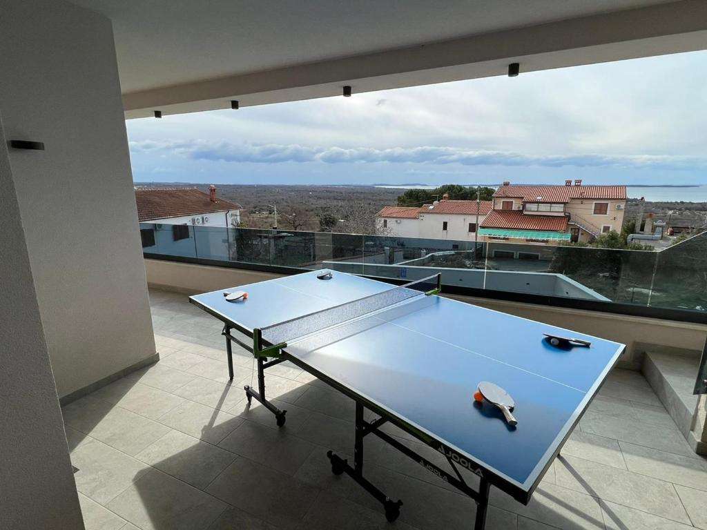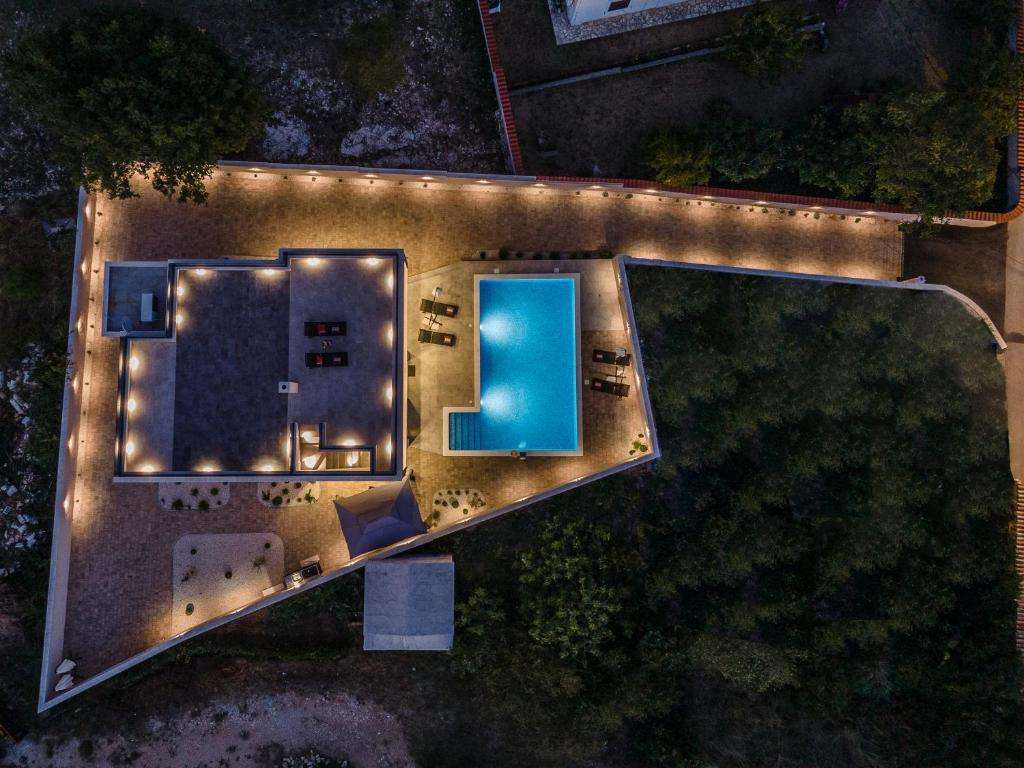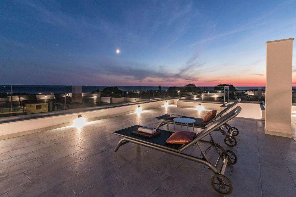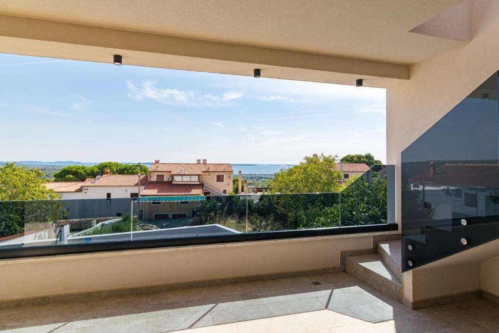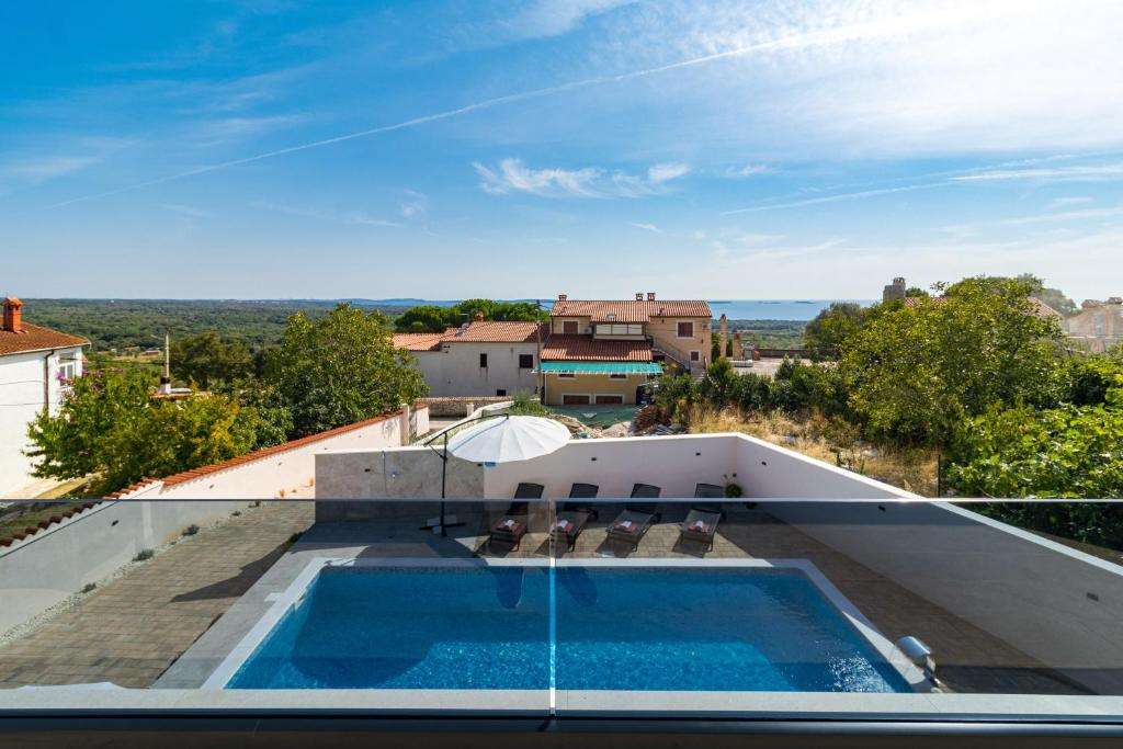 A modern villa with a swimming pool and a panoramic view of the sea near Poreč is for sale. The villa is located in a quiet location surrounded by nature and greenery.