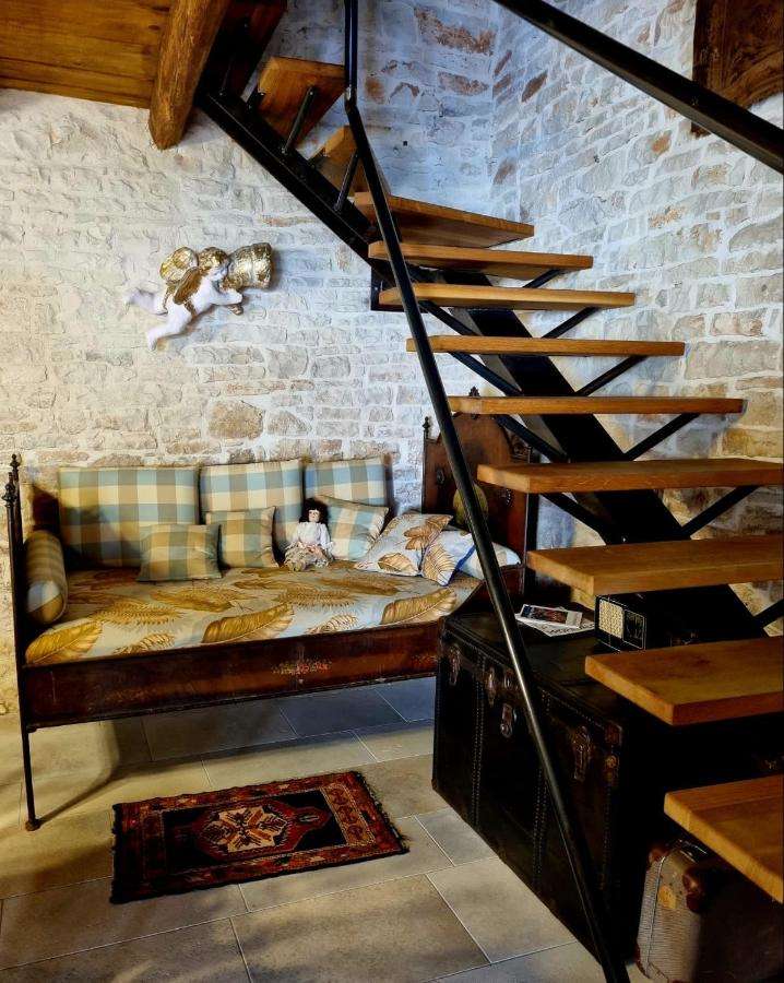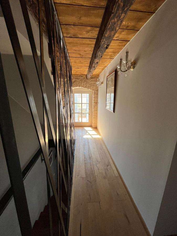 The heating and cooling system in the home is excellent. The ground level also comprises underfloor heating, a fireplace, and a majolica stove, in addition to the heat pump that heats and cools the home. All the wooden beams, tiles, and carpentry were made of larch, which gives the house a rustic and traditional spirit. The house's interior was designed in a way that aimed to preserve as much as possible its original style.