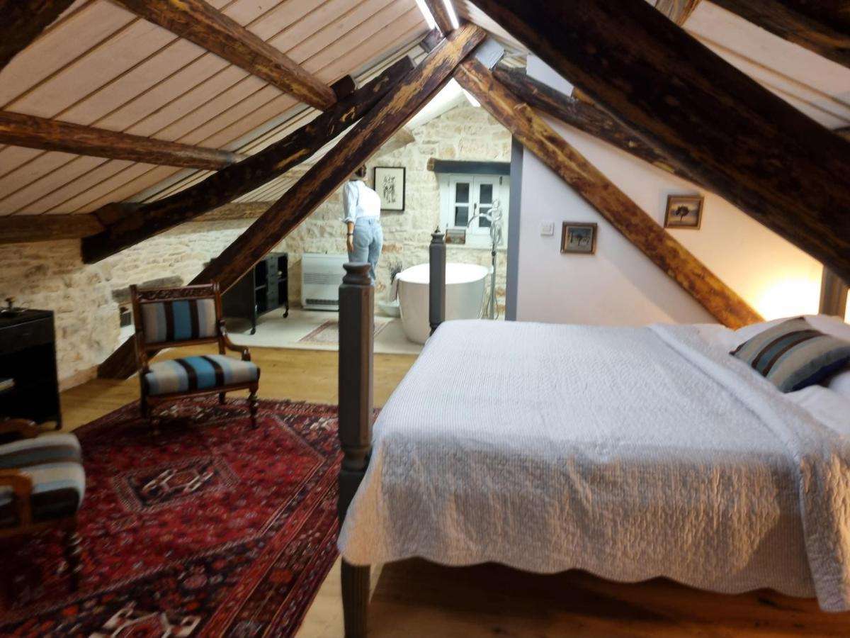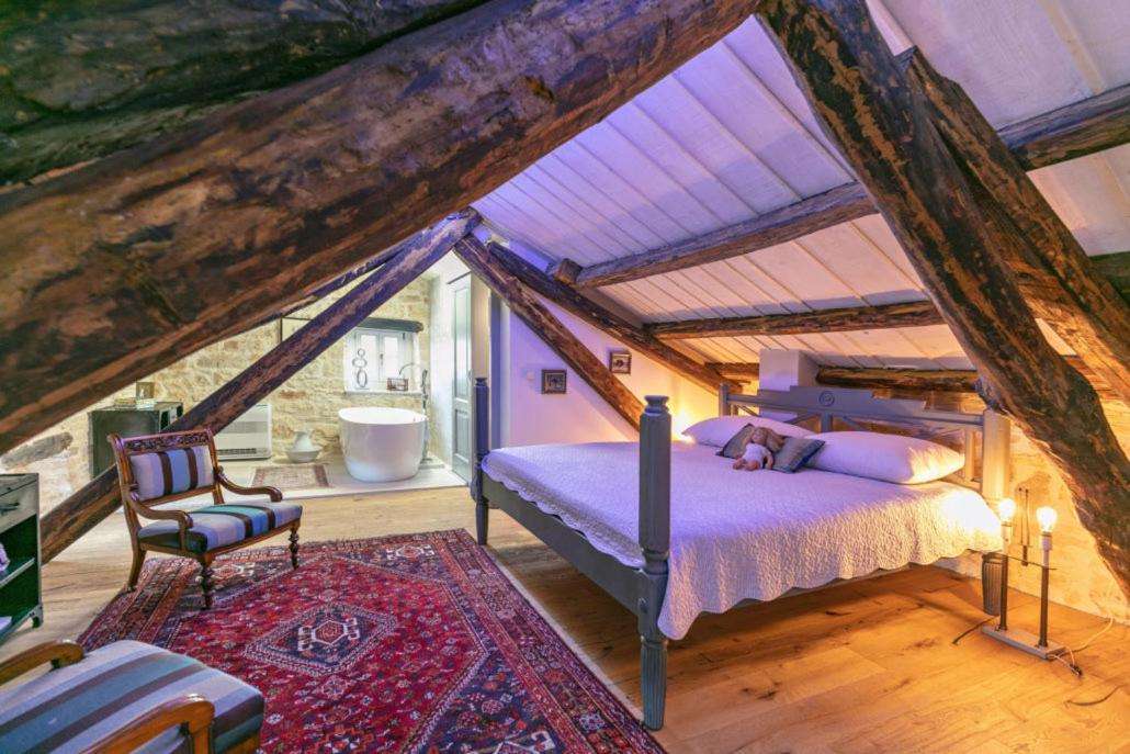 A huge bedroom with private bathroom, as well as two smaller bedrooms with private bathrooms, that share access to the terrace, are on the first level. Another enormous bedroom with shower is located in the attic of the residence. A 30-m2 swimming pool with salt water is located in front of the property, which may be heated if necessary. A summer kitchen, a pool engine room, and a washing area are located next to the pool. It is made of a disused bread oven.